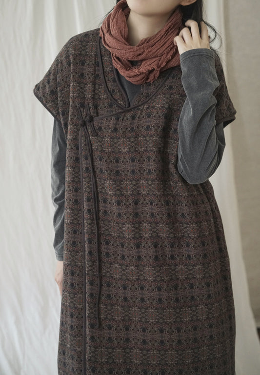 落ち着いたエスニックパターン◇暖か ダブルフェイスコットン スタンドカラー 中綿ロングベスト◇