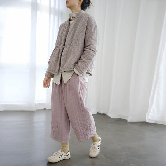 特徴的なラペルがポイントに◇暖か軽量で日常使いにぴったり◇ノーカラーリネン中綿ジャケット△