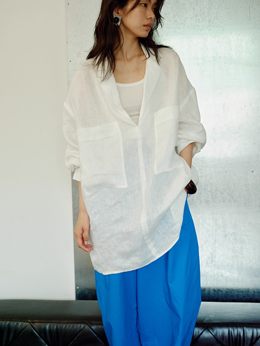 胸ポケステッチとボタンもポイントに✩リネン ゆったりシルエット バンドカラーポケットシャツ✩ Mサイズ