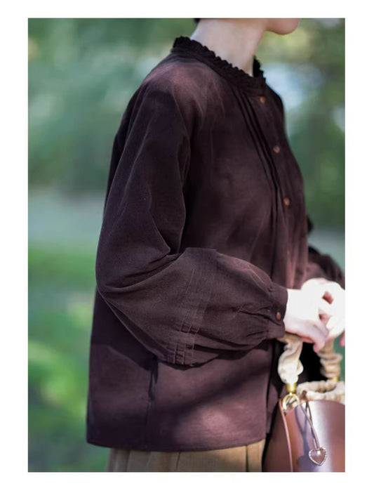 △薄手コーデュロイ ドロップショルダー フリルネックブラウス シャツ△