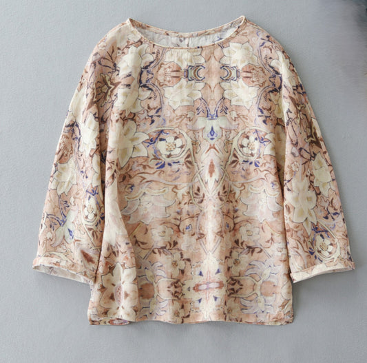 ◇ボタニックプリントが美しい◇ラミー苧麻100% ドロップショルダープルオーバーシャツ◇