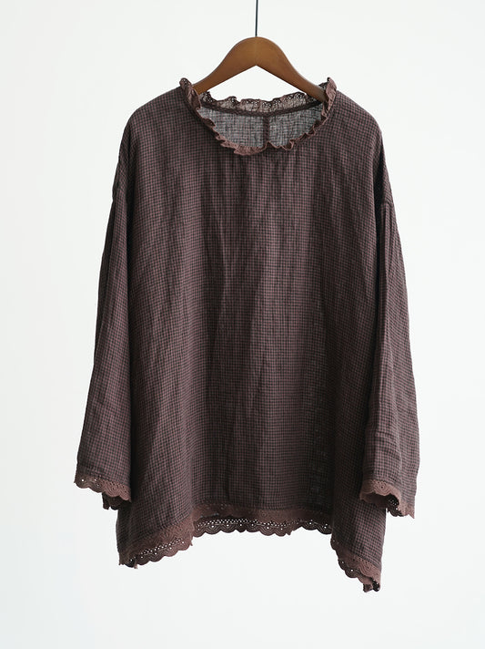△薄手格子柄チェックリネン フリルネック ドロップショルダー ブラウス シャツ△