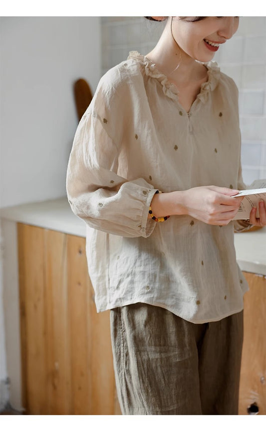 ✩フリルネック ラミー 刺繍 ドロップショルダーシャツ✩S/M/L