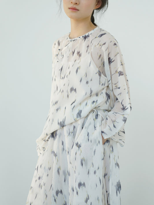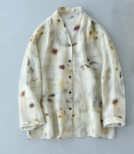 ◇水彩プリントが美しい◇ラミー苧麻100% ノーカラーシャツ◇