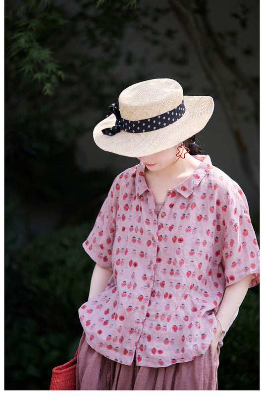 ◇イチゴ柄が可愛い◇ゆったりシルエット ドロップショルダーリネン5分丈シャツ◇M/Lサイズ