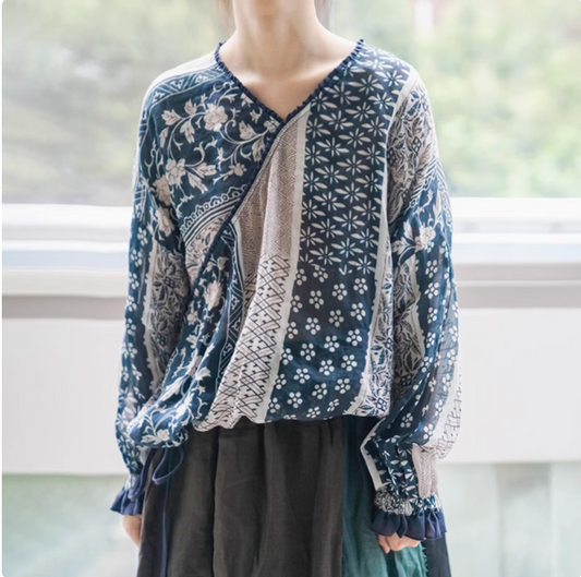 ◇綺麗な色味のボタニックプリントとオリエンタルなデザインが気分◇ロングスリーブ ラミーブラウス◇