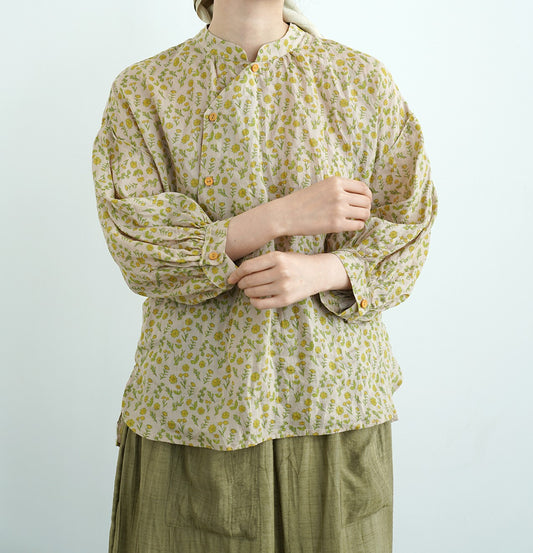 絶妙な色味のボタニックプリント◇ラミー ゆったりバンドカラーシャツ ブラウス ◇