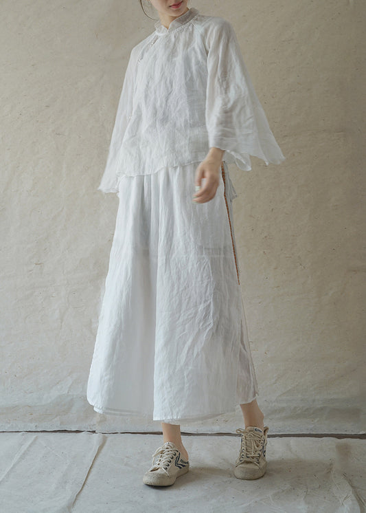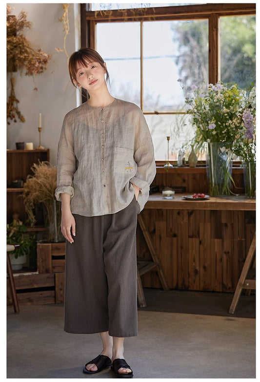◇ドロップショルダー刺繍入りリネンノーカラーシャツ◇