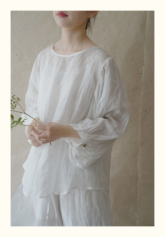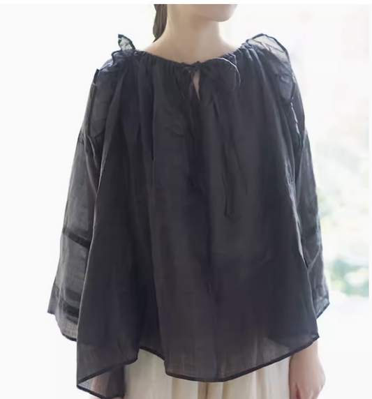 ◇3色展開◇フリルネックリネン ドロップショルダー ブラウス◇