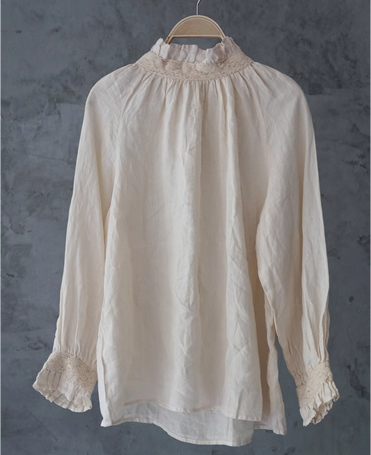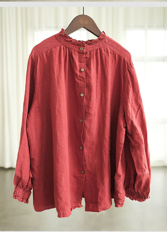 3色展開◇控えめなフリルネックが上品に◇リネン ゆったりシャツ◇