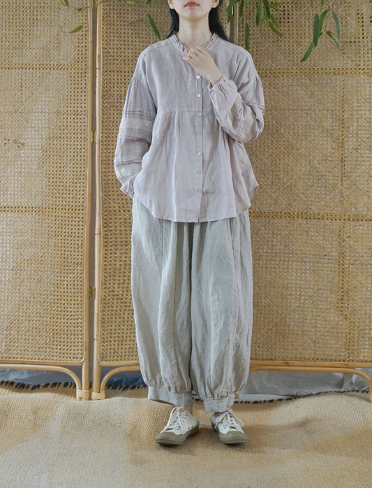 2色展開◇ゆったりシルエット バンドカラーワッシャー ラミー シャツ◇