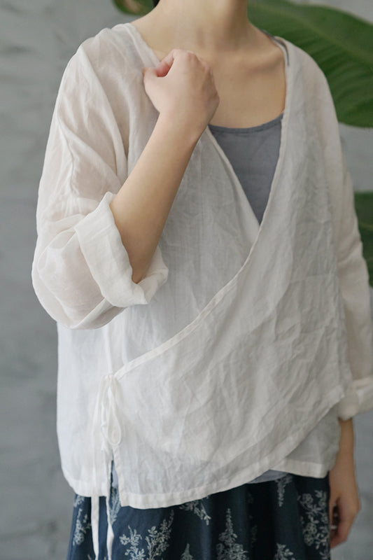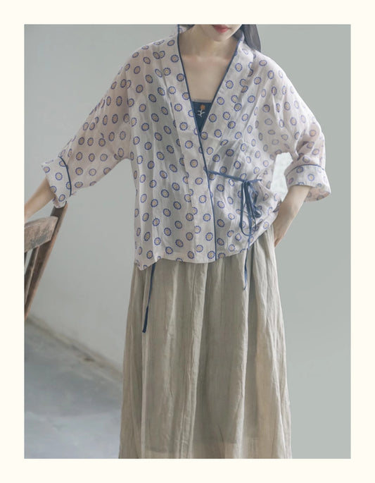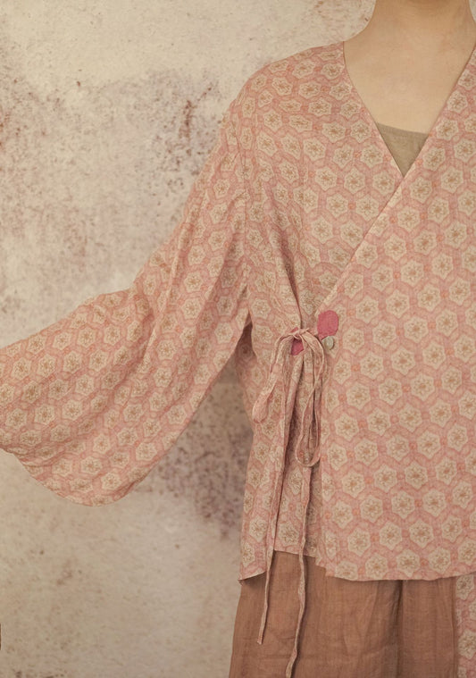 ◇ブロックプリント調の柄が美しい◇ラミー着物スリーブ カシュクールラップシャツ ◇