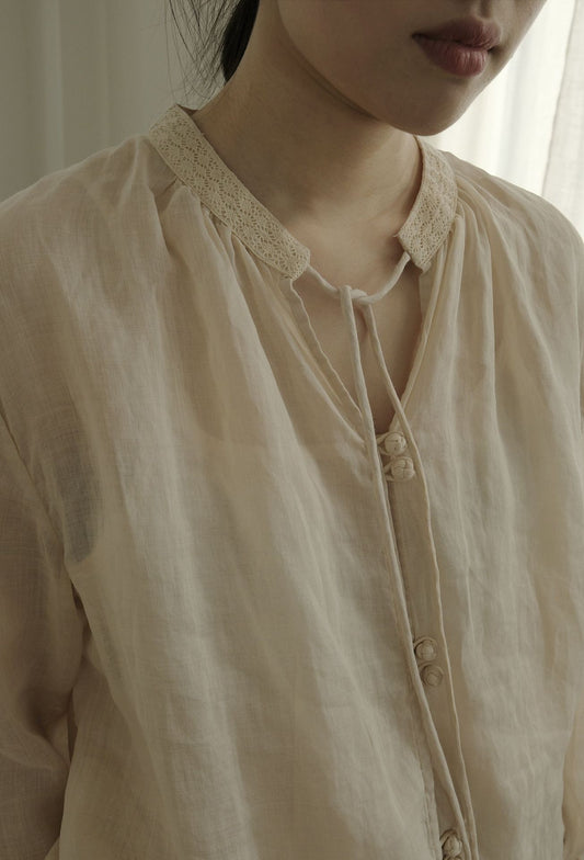 ◇レースのスタンドカラーとストリングスがポイントに◇100番手 ラミーゆったりブラウス◇アイボリー/グリーン