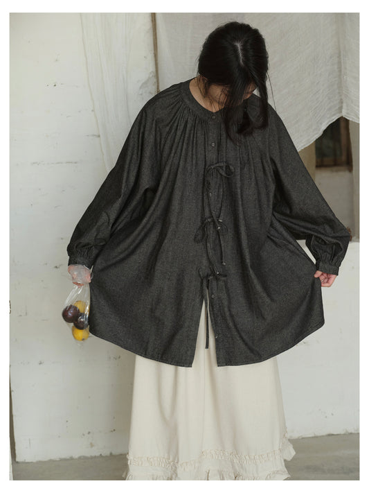 ◇フロントリボン使いがポイントに◇ブラックデニム ロングブラウス◇