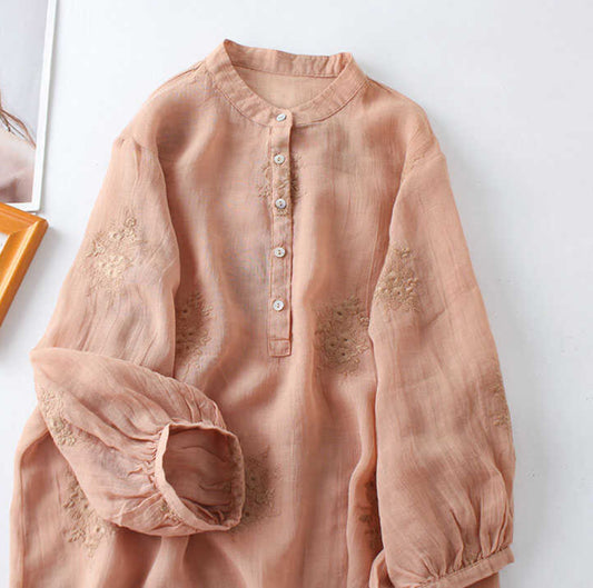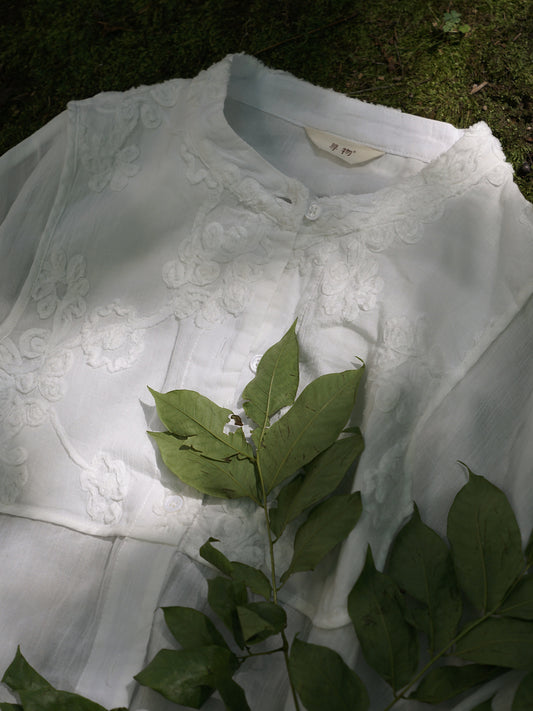 ◇リネン刺繍 ドロップショルダー フリルネックシャツ◇