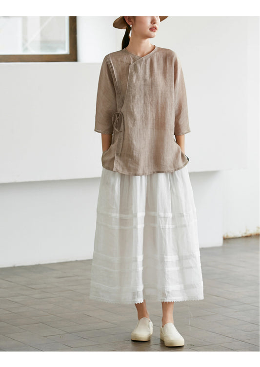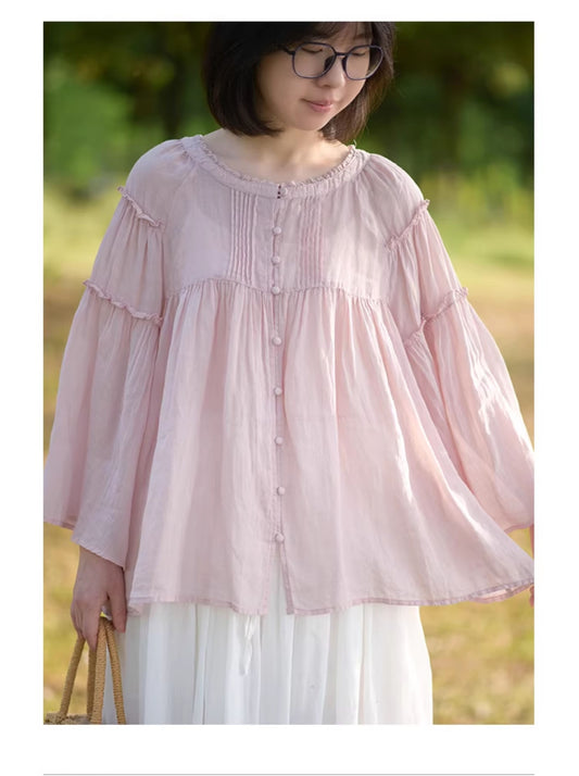 2色展開◇フリルネック リネンコットン ブラウス◇