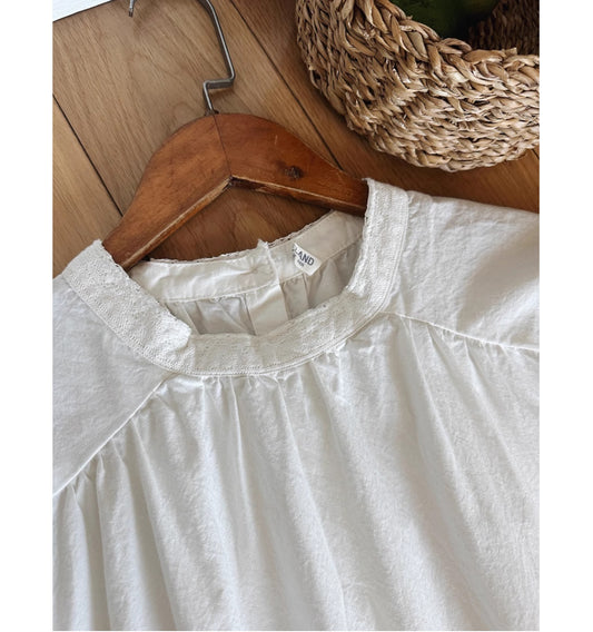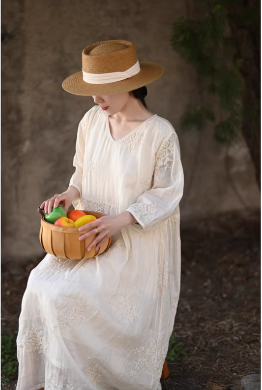 2色展開◇繊細な刺繍装飾◇ラミー苧麻100% 7分丈ロングバンドカラーワンピース◇裏地付き