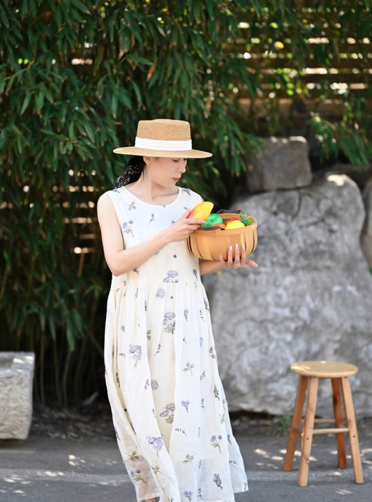 小ぶりな襟が可愛い◇ウエストギャザー 花柄刺繍 ラミーワンピース◇