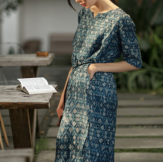 アブストラクトな水彩プリントが美しい◇ラミー苧麻100% ロングワンピース◇
