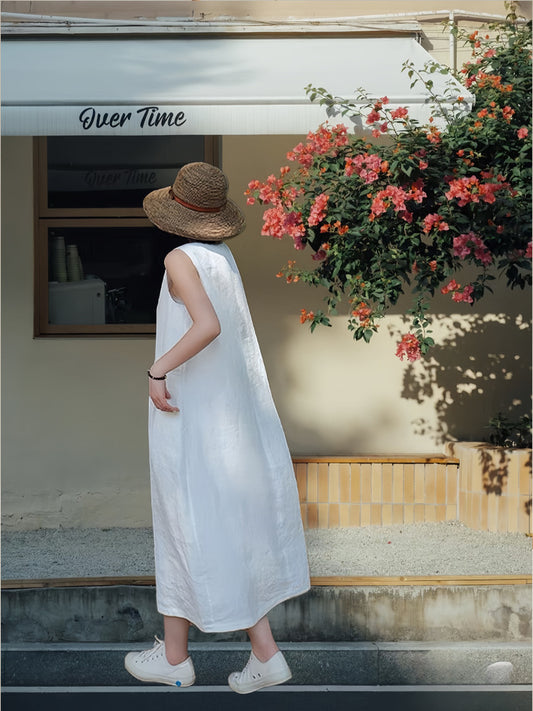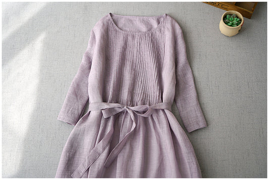 3色展開◇ピンタックデザイン ラミー苧麻100% 7分丈ロングワンピース◇裏地付き