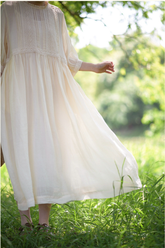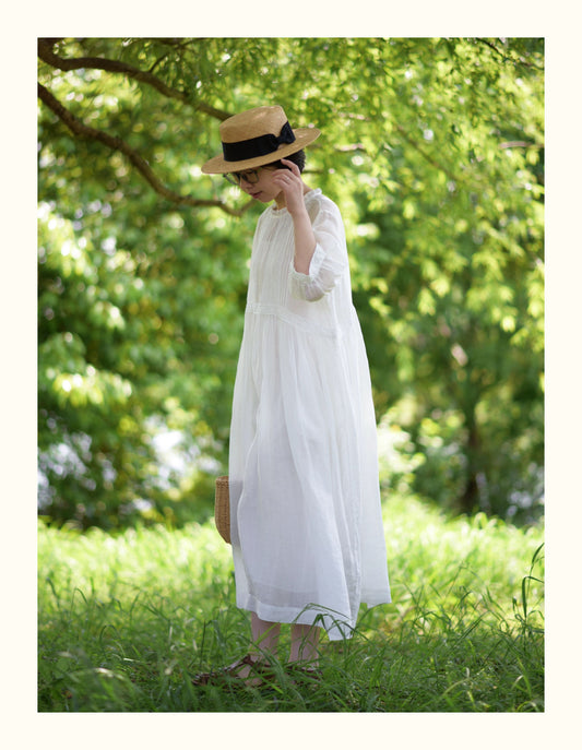 2色展開◇胸周りのピンタックデザインが美しい◇たっぷりギャザーコットンロングスモックドレス◇