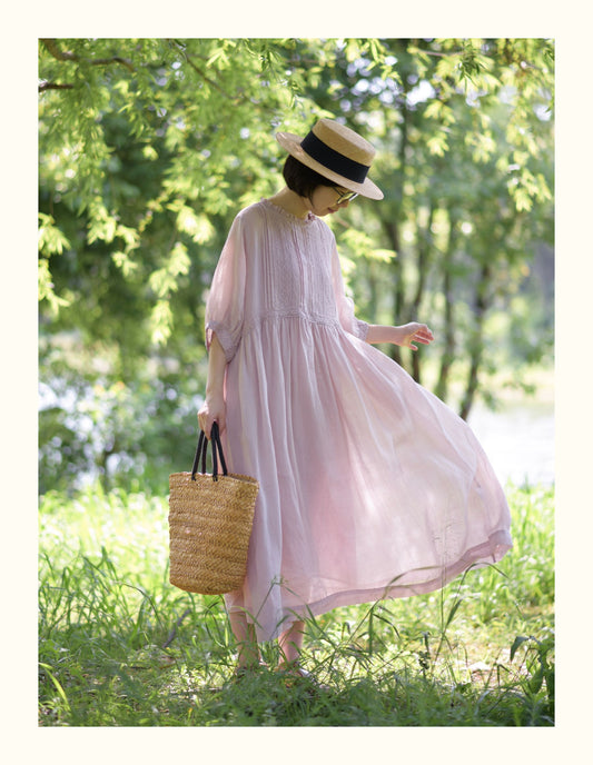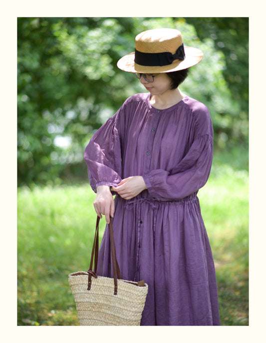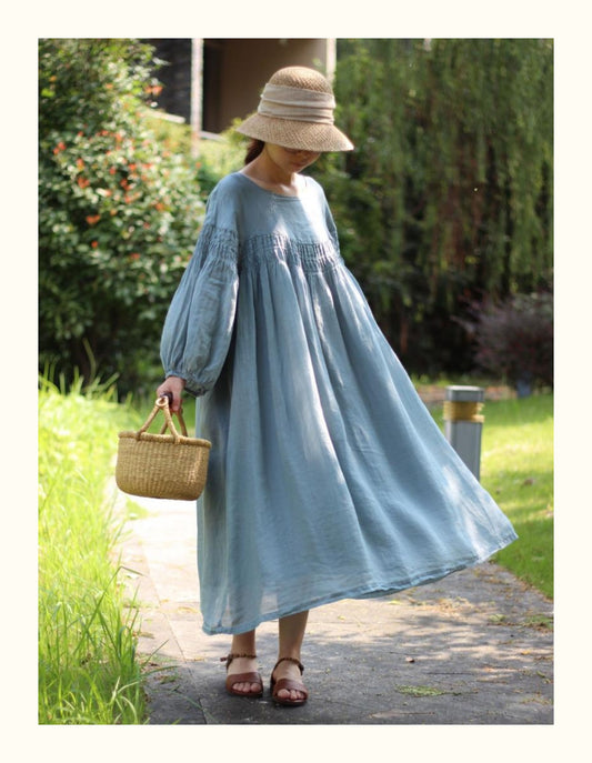 3色展開◇胸周りのピンタックデザインが美しい◇たっぷりギャザーラミーロングスモックドレス◇