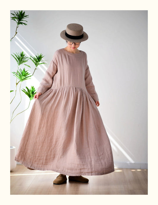 3色展開◇たっぷりギャザーラミーロングスモックドレス◇