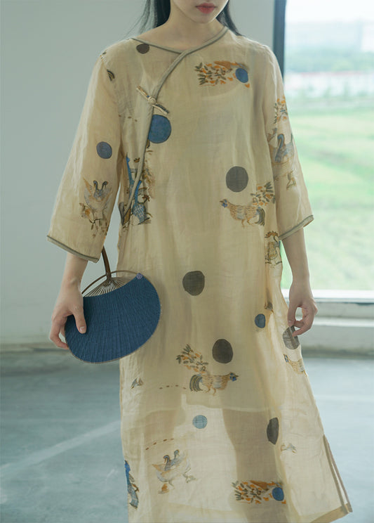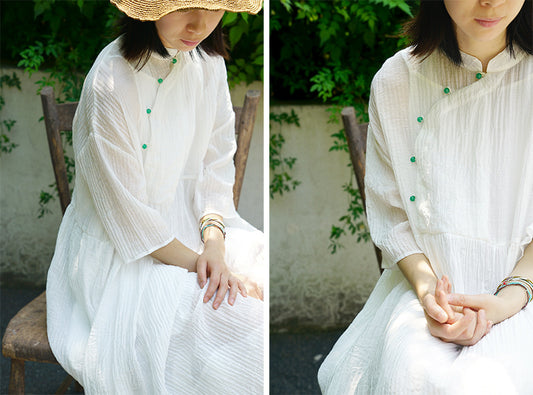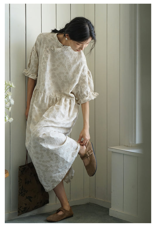 ◇オリエンタルな雰囲気が素敵◇コットンリネン 花柄ジャガード チャイナボタン ワンピース◇