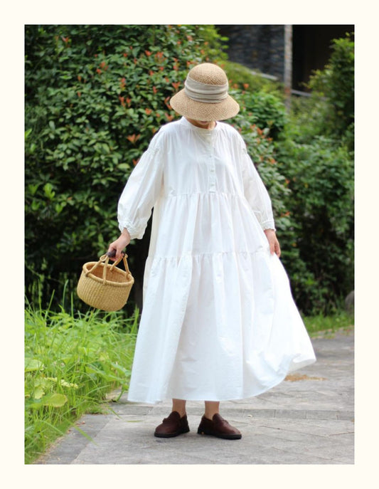 ◇バンドカラー タイプライターコットン ティアード ワンピース◇