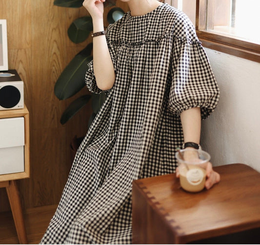 ◆お出かけ 2次会 パーティーにも◆リネンコットン ギンガムチェック パフスリーブ ロングドレス◆