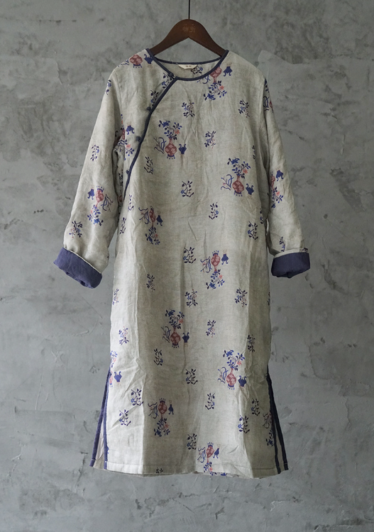 ◇可愛いボタニックプリント◇うっすら中綿生地で暖かオリエンタル リネンワンピースドレス◇
