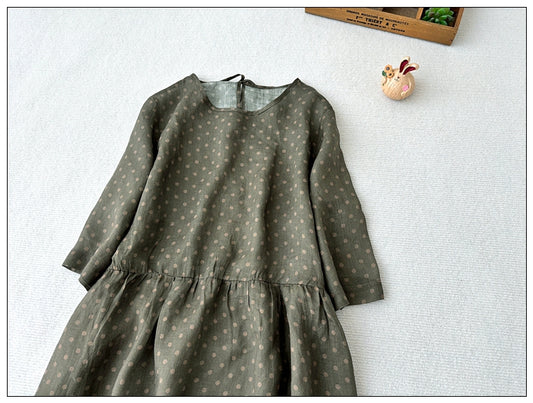 ◇落ち着いた色味のドットプリントが美しい◇ラミー苧麻100% ロングワンピース◇