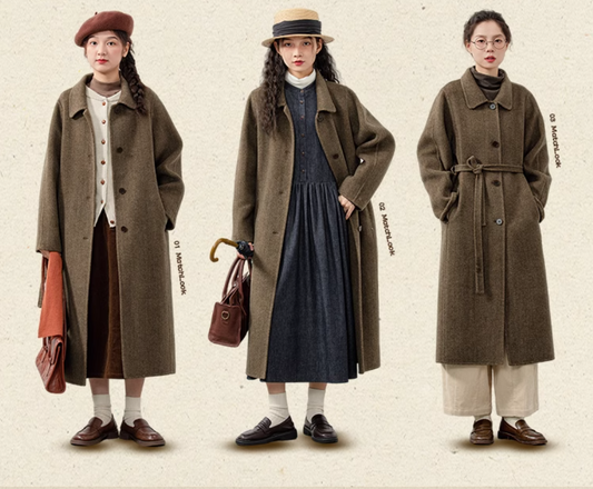 ダブルフェイスウールで裏地なしでも暖か△ウールヘリンボーンツイード ステンカラーコート△