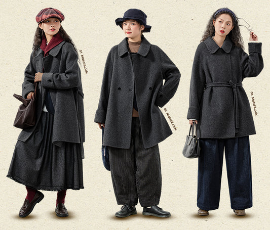 ダブルフェイスウールで裏地なしでも暖か△ウール ミドルレングス コート△S/Mサイズ
