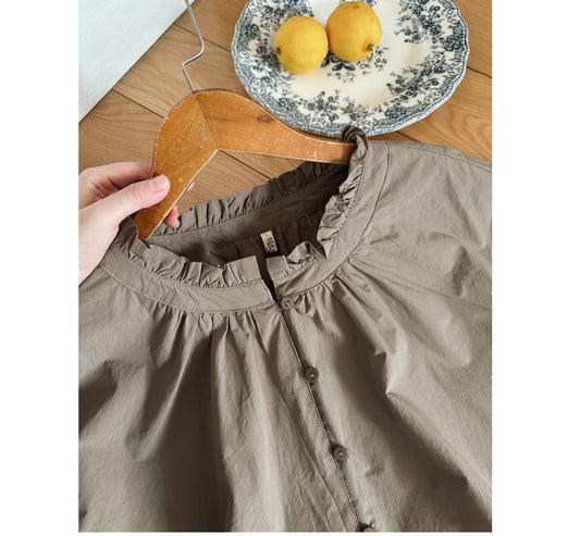 ギャザー使いでふんわりシルエット☆ドロップショルダー タイプライターコットンフリルネックシャツ☆