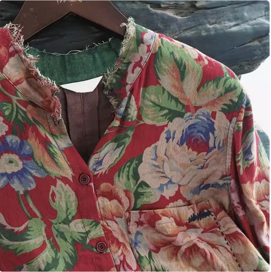 ハンドステッチと切りっぱなしデザインがアクセントに◇レトロな牡丹柄コットンシャツ◇