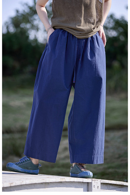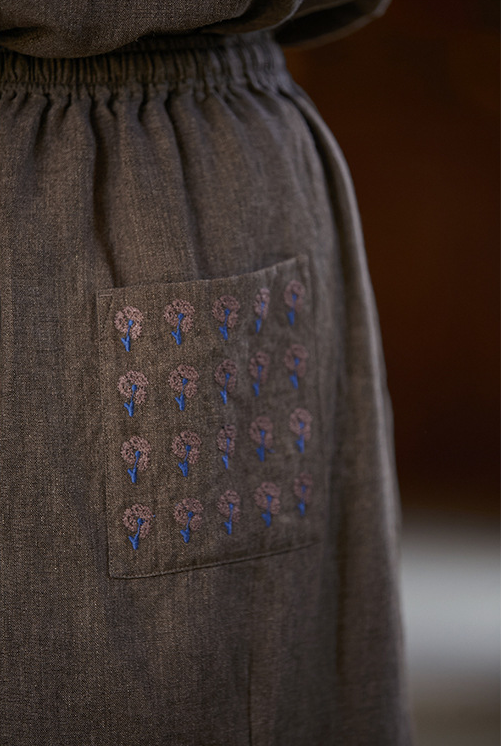 ブルーの鮮やかな色味にハンドステッチ刺繍が映える◇リネンコットンイージーパンツ◇