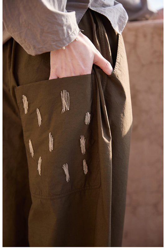 バックポケットの刺繍が可愛い◇コットン 9部丈 イージーワイドパンツ◇ブラウン M/Lサイズ