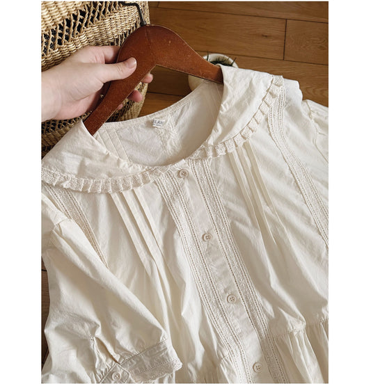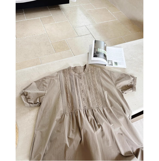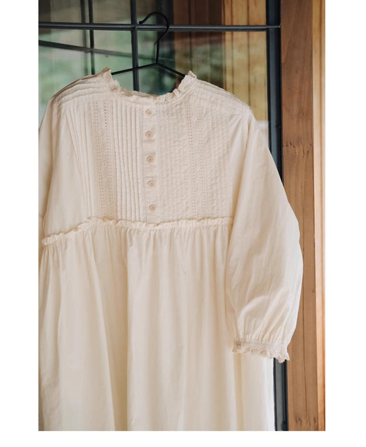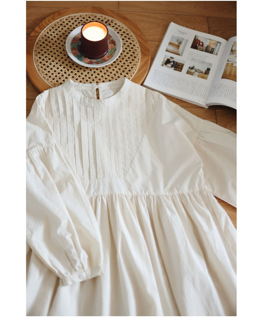 ピンタックとレースの切り替えが美しい△高密度コットン バンドカラー ロングワンピース△