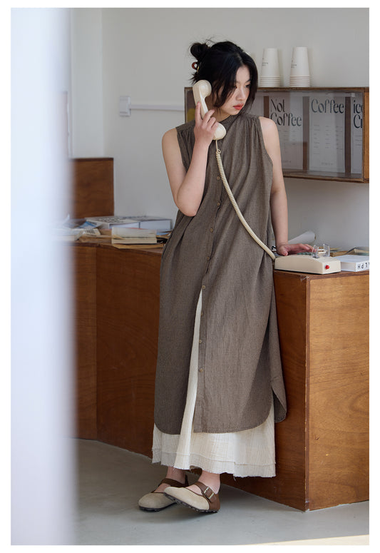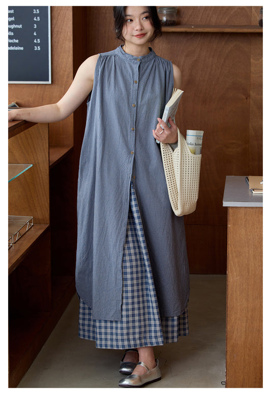 バンドカラーに肩のギャザーが上品◇程よいゆったりギンガムチェックノースリーブワンピース◇