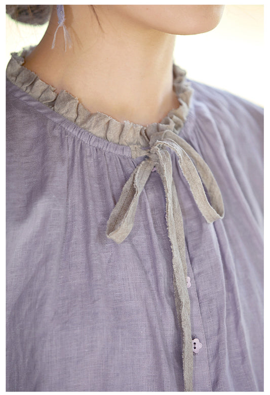 ハンドステッチング&フリンジが可愛い☆ゆったりシルエットリネンノーカラーシャツ☆