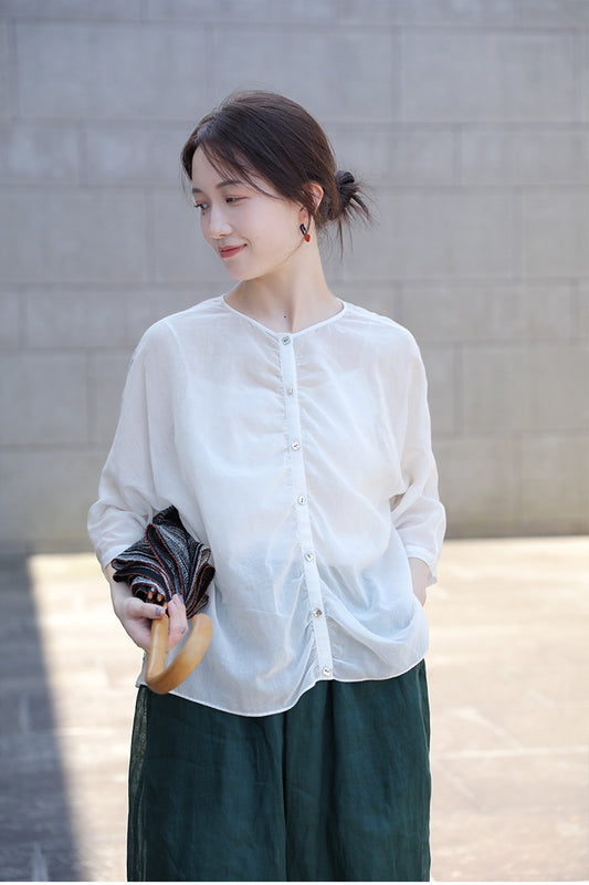 フロントボタンとパッカリングデザイン&バックのデザインがポイントに✩コットンノーカラー ドルマンスリーブシャツ✩