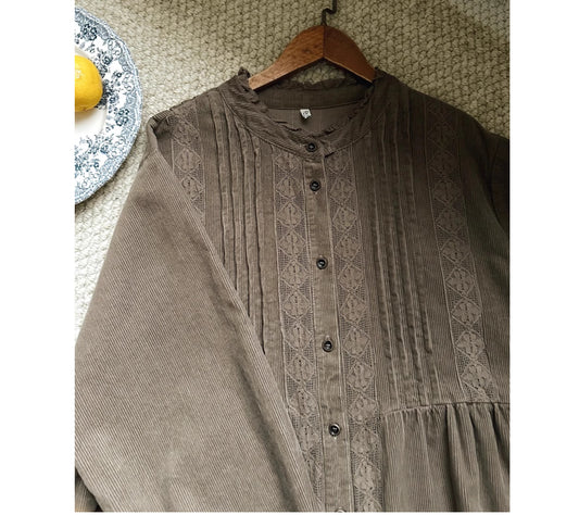 ピンタックとレースの切り替えが美しい△コーデュロイギャザー アンティークデザイン ロングワンピース△