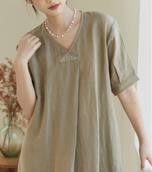 ハンドステッチ刺繍がデザインポイントに☆質の良いリネン半袖ドロップショルダーロングワンピース☆