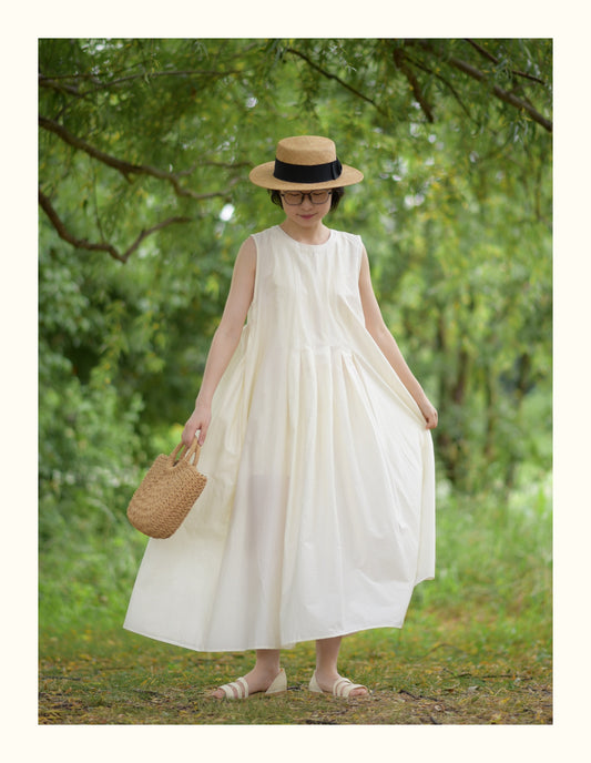 バックリボンが素敵◇ウエストタック高密度コットン ノースリーブ ワンピース◇