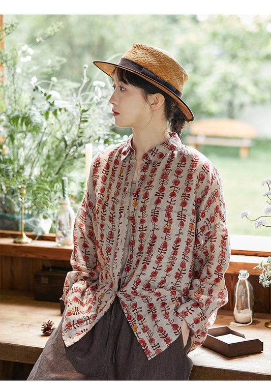 ブロックプリント調花柄が可愛い✩リネン ワイドシルエット シャツ✩