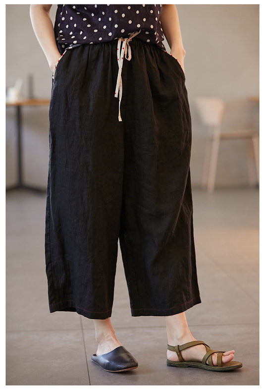 バックポケットのプリントが可愛い★ゆったりシルエット★リネン 9部丈イージーワイドパンツ★