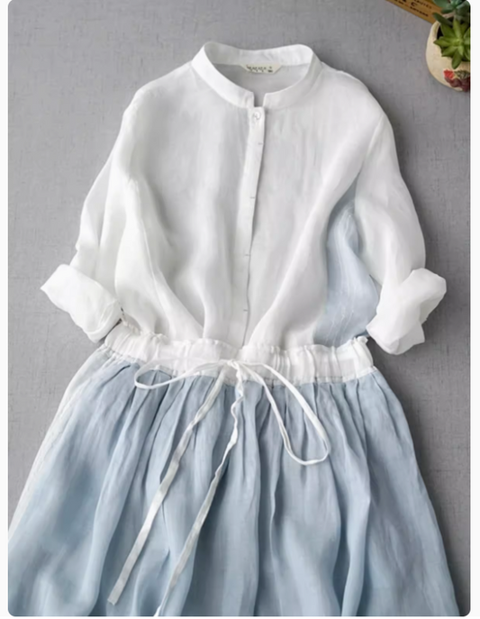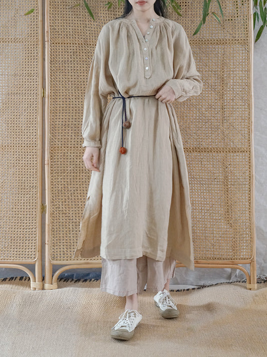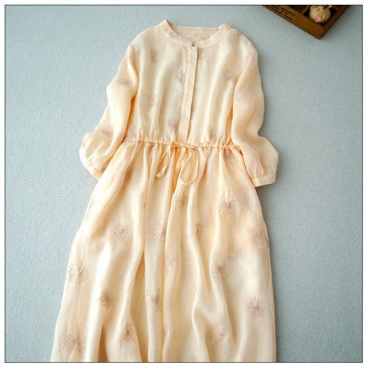 2色展開◇繊細な刺繍装飾◇ラミー苧麻100% 7分丈ロングバンドカラーワンピース◇裏地付き