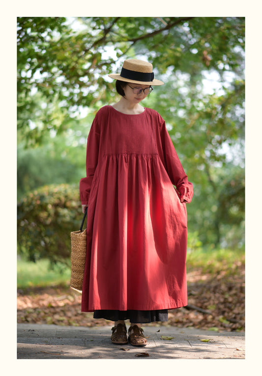 2色展開◇胸周りのピンタックデザインが美しい◇たっぷりギャザーコットンロングスモックドレス◇