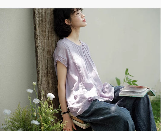 2色展開◇苧麻ラミー フレンチスリーブ レース&ピンタックシャツ◇